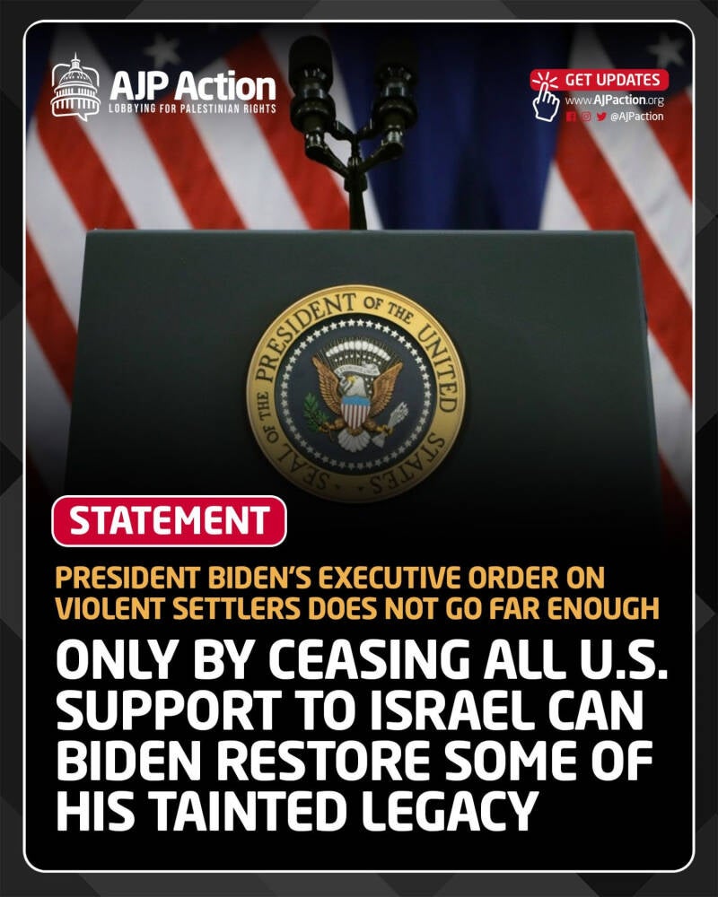 This Executive Order, ostensibly targeting violent settlers in the West Bank who have been attacking Palestinians, must be viewed in the context of a broader inconsistency in the administration's approach. While the order sanctions specific settlers, the President's unwavering support for Israel, including bypassing Congress to provide additional military aid amidst Israel's ongoing genocide in Gaza, raises questions about the sincerity of these measures.