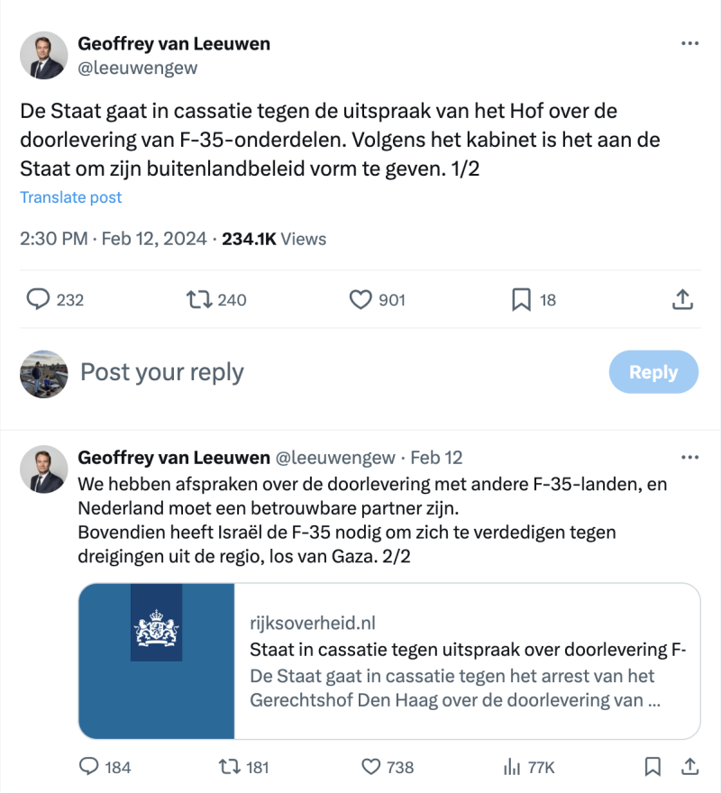 Dat heeft zeker voor Nederland directe consequenties, bijvoorbeeld wat betreft de levering van onderdelen van F-35-gevechtsvliegtuigen aan Israël. Op 12 februari a.s. doet het Gerechtshof Den Haag in hoger beroep uitspraak in de zaak die o.a. The Rights Forum samen met Oxfam Novib en Pax voor Vrede tegen de Nederlandse Staat heeft aangespannen. Na de ondubbelzinnige uitspraak van het Internationaal Gerechtshof lijkt het ondenkbaar dat Nederland de levering van de F-35-onderdelen kan voortzetten zonder het risico op medeplichtigheid aan genocide.