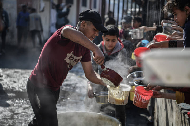 Amid a serious risk of starvation, desperation and scarcity have led to a near total breakdown in civil order. Palestinians taking supplies from the back of a truck in northern Gaza, 25 February 2024. Photo by OCHA