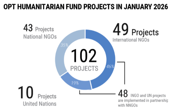 On 26 February, partners also distributed food assistance as well as shelter and hygiene items to over 400 families in the Bani Suhaila area of Khan Younis. The targeted families are residing in a hard-to-reach and underserved area and have experienced repeated displacement in recent months due to shifts of the “Yellow Line”.