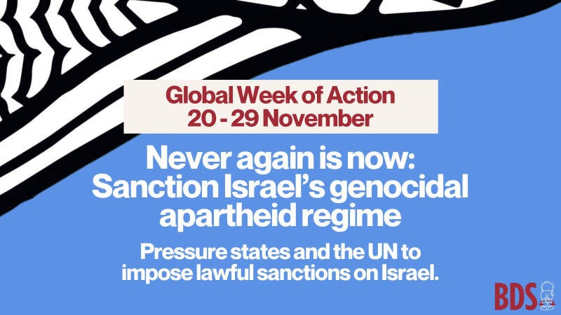 Join us in a global week of action from 20th to 29th November and pressure your government to heed the unified Palestinian call for sanctions by: