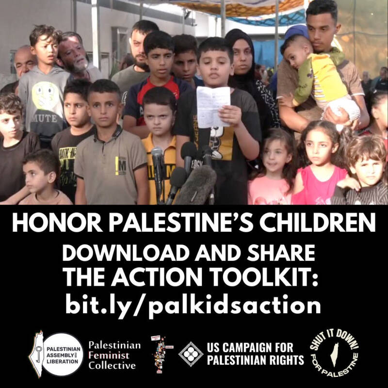 - Demand justice for Palestine’s children. Join the Children's Days of Action with your family and community on Nov. 7-10, 2024, marking one year since Palestinian kids held their own press conference outside Al Shifa Hospital.