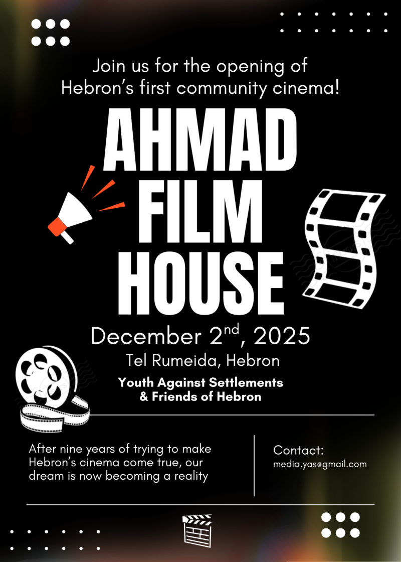 we are launching our new community film house! After nine years, our dream is finally becoming true and we are opening a cinema for the local community in Tel Rumeida, Hebron. The cinema is part of our initiative to provide local film makers—often youth, women and children—with a place to show your work. These include documentaries, short films, and fiction. We will also be screening movies for entertainment to help keep up the spirit of people living in some of the harshest conditions of occupation, as well as documentaries with educational value.