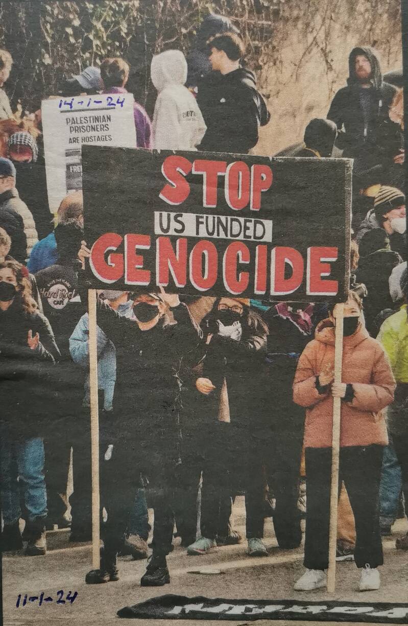 “Downtown rally calls for US to stop military aid to Israel”. Brattleboro Reformer. December 23. 2023