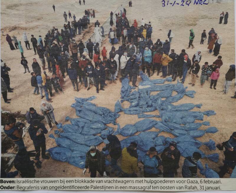 Onze premier heeft vanaf 7 oktober de verkeerde kant gekozen. Zijn “we hebben dit niet zo heel vaak meegemaakt, dat dit conflict zich richt op heel gewone mensen” was tenenkrommend. Zoals Ramsey Nasr ons heeft uitgelegd, de premier ziet in Israëli’s kennelijk wèl gewone mensen maar in Palestijnen die al 75 jaar door dit conflict geraakt worden, niet. Het ‘geen ja maar, nu even alle kritiek op Israël inslikken' was een opzichtige fout. Als historicus heeft hij in zijn analyse van die dag, als uit de hand gelopen uitbarsting van 75 jaar woede door onderdrukking, hopeloos gefaald. We zijn nu 30 duizend doodgebombardeerde grotendeels weerloze Palestijnen verder, we zijn 70.000 gewonde en voorgoed verminkte bewoners van Gaza verder. We zijn ongetelde aantallen ouders zonder kinderen verder, en kinderen zonder ouders. Met steun van Biden, president van 'de grootste democratie ter wereld’ raast de zionistische Vernichtungskrieg voort. In de bevriende 'enige democratie in het Midden Oosten’ is de Stahlhelm van weleer een keppel geworden.