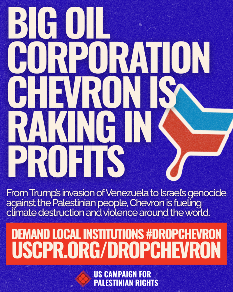 Chevron is one of the world’s most environmentally destructive corporations, with a long history of harming people and the planet. While Palestinians in Gaza freeze in flooded tents, Chevron supplies nearly half of the electricity to Israel.
