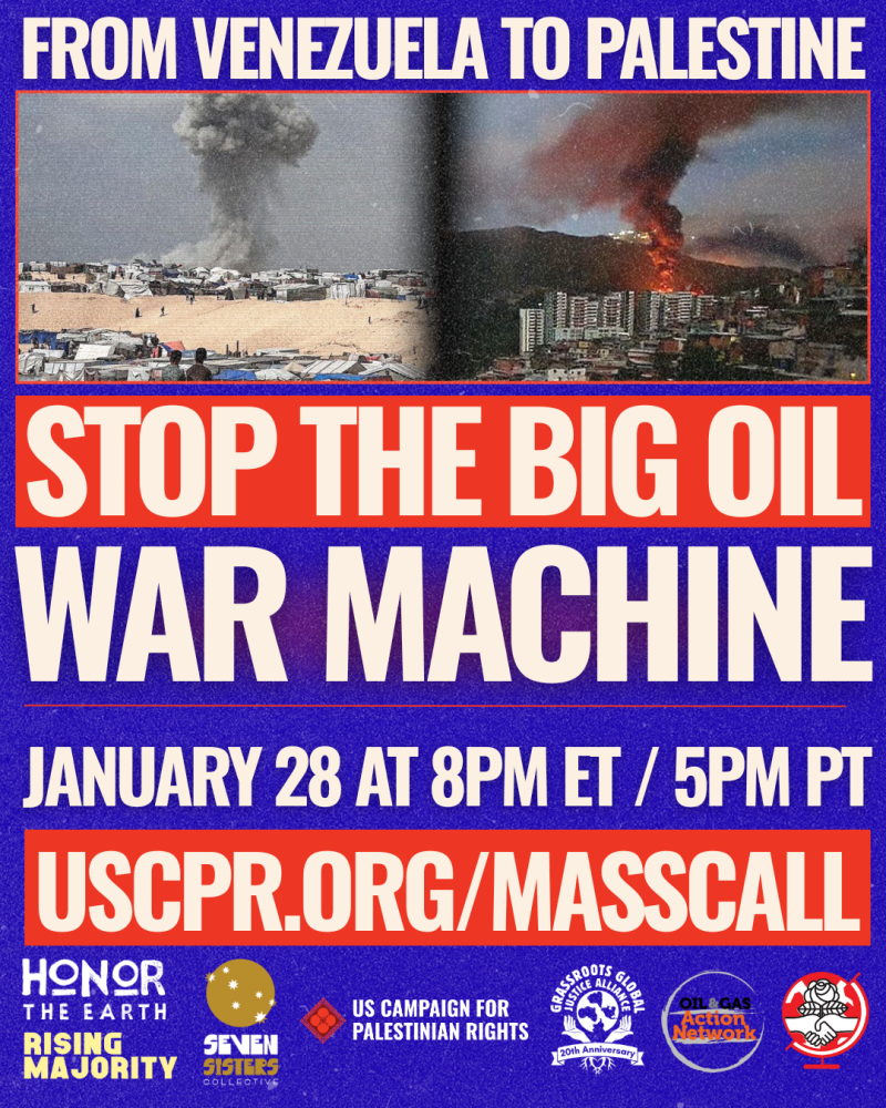 Take a stand against Big Oil’s profiteering from genocide and war. You can join us on the upcoming action call “Stop Big Oil’s War on Venezuela,” this Thursday, Jan. 8 at 8PM ET / 5PM PT.